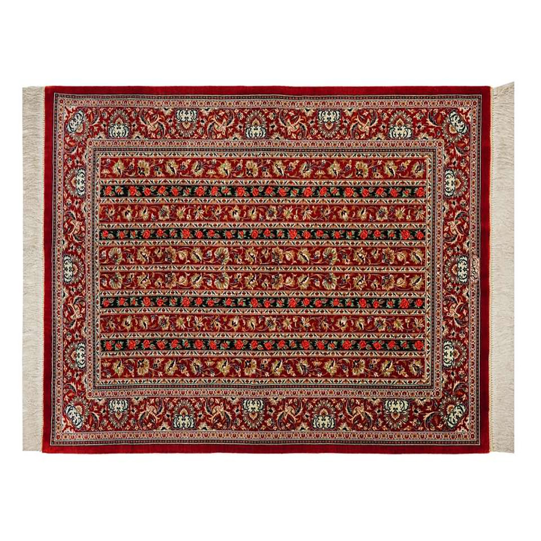 The Qom silk rug with the “Moharramat” design is one of the most exquisite examples of Persian carpet weaving, showcasing the refined artistry and craftsmanship of Qom’s master weavers. The term Moharramat refers to the parallel vertical stripes featured in the design, woven with perfect symmetry and order, giving the rug a regal and distinguished appearance.